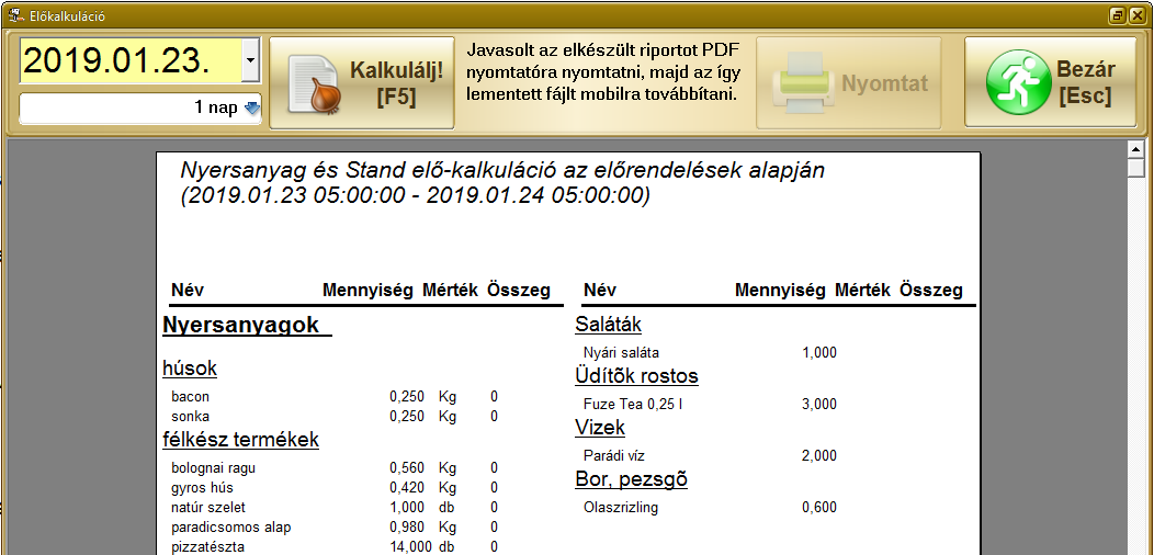 Azaz az előrendelések és menüztetés anyagfelhasználásának kalkulációja
