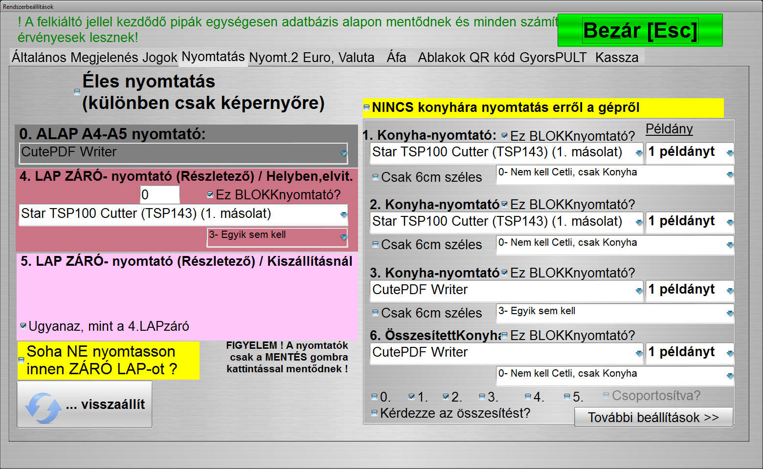 Sokféle nyomtatási opció közül választhatunk, mely mindenféle vendéglátóhelyet lekövet. Külön szabályozhatjuk, melyik ételt hová küldje, hány példányban, hogyan összesítve. Kell-e hozzá etikett címke (cetli) vagy sem, egyáltalán kinyomtassa-e vagy sem, A5 vagy blokknyomtató formátumra optimalizáljon, stb…