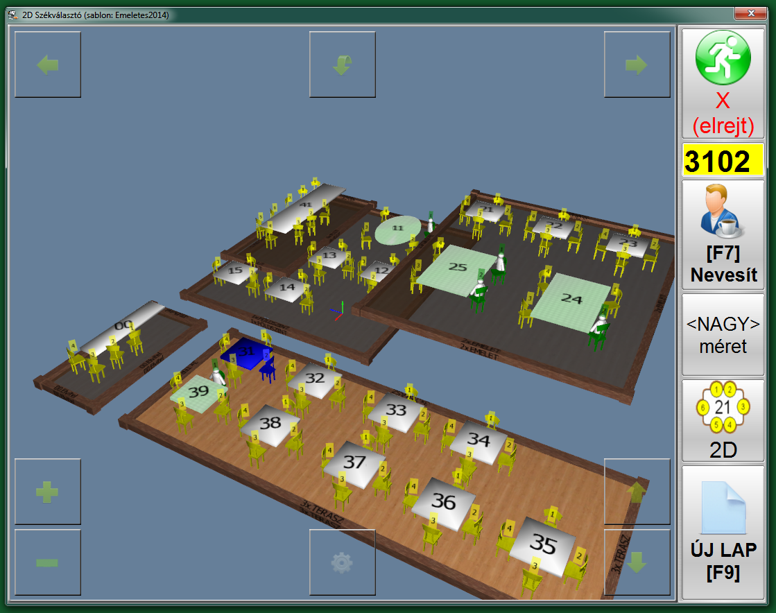- Szöveges (1D), felülnézeti (2D) és forgatható+nagyítható térbeli (3D) asztaltérkép segíti a pincérek munkáját